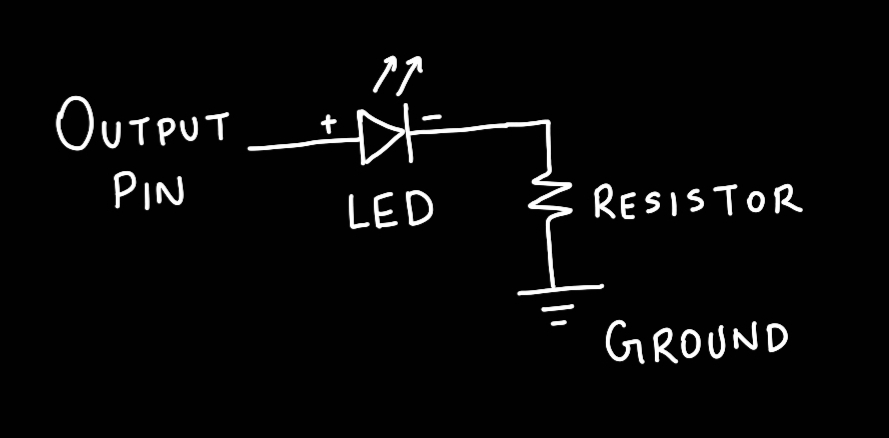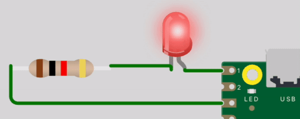 Cool! Are you satisfied? I am not. In real hardware projects, most of the LEDs to be controlled are outside the microcontroller's circuit board. Let's take it up a notch and blink an external LED. When wiring up an LED, you need to ensure you are not putting too much current through it, otherwise it may 'pop' and die - trust me, I've done it too many times. To control the current going through it, we use a resistor. The higher the resistance, the lower the current. The lower the current, the lower the brightness of the light from the LED.