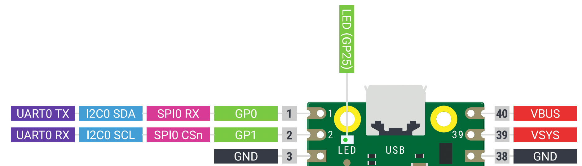 So the onboard LED is on pin GP25. Take a moment here to also notice how pins 1 and 2 have multiple labels attached to them. This is common in microcontrollers and it signifies that these pins can be used for any one of these labeled functions, and that it's up to the programmer to decide which one will be active.
