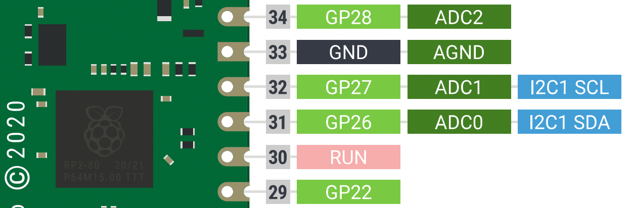 Wait a second. Does that sound familiar? If you read the previous tutorial, you'll remember that we measured a fraction of the supply voltage then too! The only difference is that then we were measuring a potentiometer and here we want to measure a thermistor. To measure voltage across the thermistor, we need to use the ADC on the Pico. Let's look at our handy Pico pinout diagram to find an ADC pin.