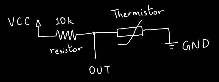 This type of circuit is called a voltage divider, because the voltage you measure at the OUT pin is a fraction of the power supply voltage VCC. In other words, the voltage VCC gets divided between the resistor and the thermistor. The fraction depends on the ratio between the resistance of the thermistor and that of the resistor (i.e. 10kΩ). Using this, and the fact that the thermistor's resistance itself depends on temperature, we can back-calculate the temperature by measuring the voltage on the OUT pin.