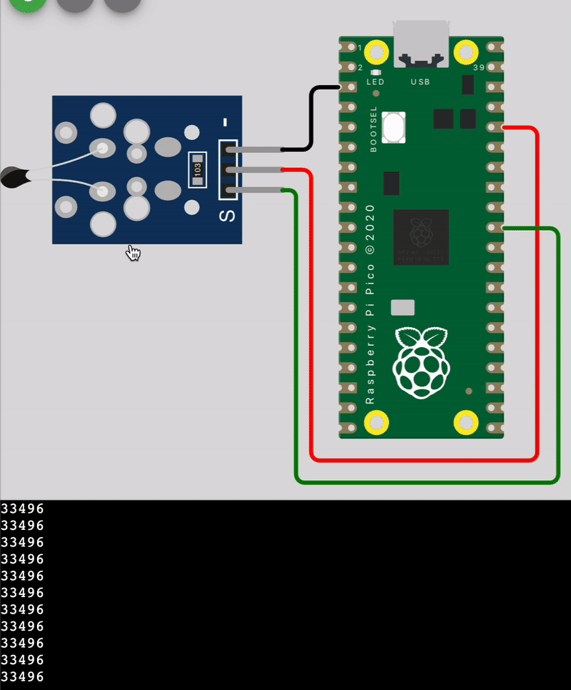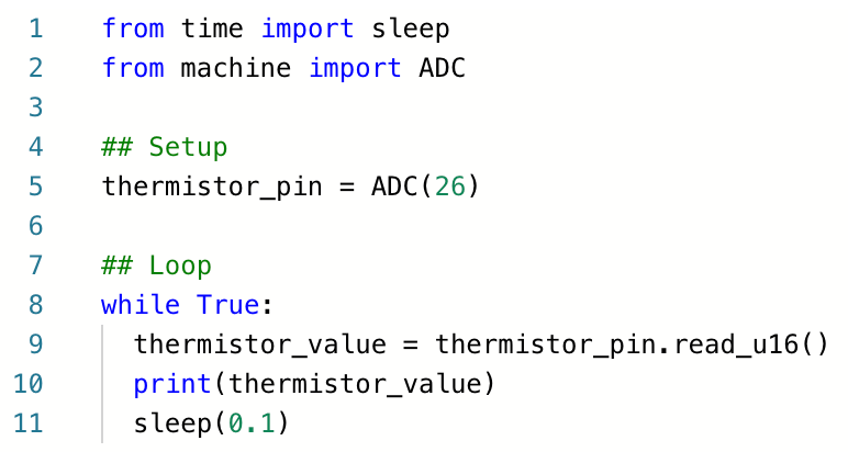 Let's read some data from the temperature sensor to get an intuition for how it changes with temperature. We will write a basic MicroPython script to read the data using the ADC, exactly as in the previous tutorial. Type this into the code editor on Wokwi.