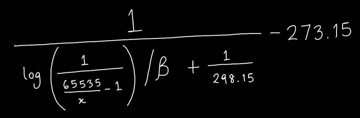 How exactly does its resistance vary with temperature, though? This is where we would get into some gnarly arithmetic. Since you'd (probably) rather not relive your high-school math class trauma, I won't spend any time deriving the formula between temperature and ADC data. But I do really enjoy showing people stress-inducing math formulas, so I've written it out here for you to see the beautiful horror I shielded you from.