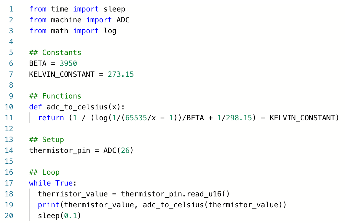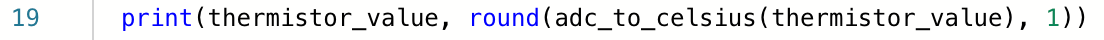 Neat! We now have a way to convert ADC values, i.e. 'x' in the formula above, into a temperature in Celsius. The β value for this particular simulated thermistor is 3950. Let's use this to create a function in MicroPython that converts ADC output to temperature. We will use this function in the main loop to convert the ADC readings and print out the temperature in Celsius. Modify your code to add these two new features, as shown below.