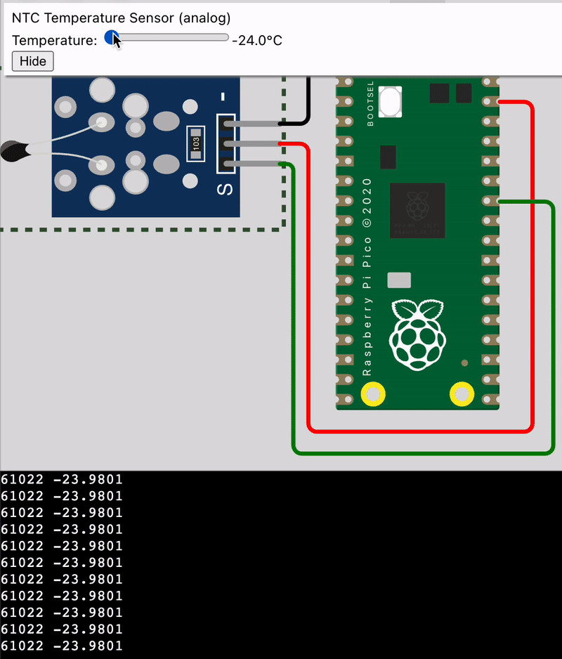 Run the script by pressing the 'play' button at the top of the simulator. By default, the temperature in the simulation environment is constant at a pleasant 24 °C so you will see the same ADC value being output over and over again in the console. To change the temperature, click on the temperature sensor while the simulation is running and you should see a slider. Play around with the temperature and notice the response in the ADC values.