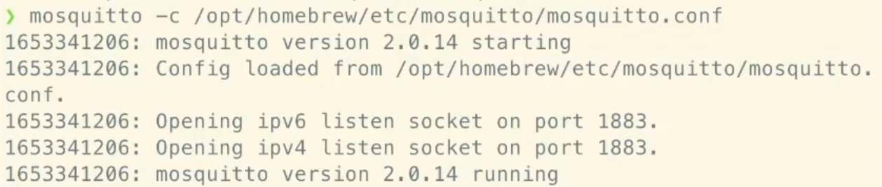 mosquitto -c /opt/homebrew/etc/mosquitto/mosquitto.confYou should see output similar to below: