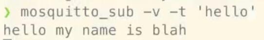 mosquitto_pub -t 'hello' -m 'my name is blah'When you hit <enter>, you should see this topic and message in the terminal where our subscriber is running: