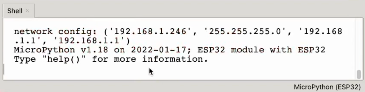 connect()Restart your microcontroller to check if the automatic WiFi connection on boot-up worked. You should see output similar to this in the Thonny shell:
