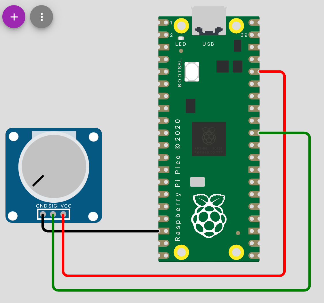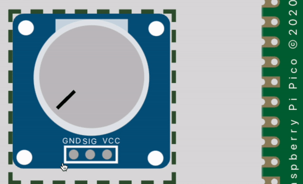 Without further ado, let's get into it! Fire up a new MicroPython project in the Wokwi simulator, click the 'plus' button at the top of the simulator, and select the Potentiometer component. You'll notice that it has 3 pins: GND, VCC and SIG. These correspond to ground voltage, power supply voltage, and the signal voltage representing the amount of rotation, respectively.