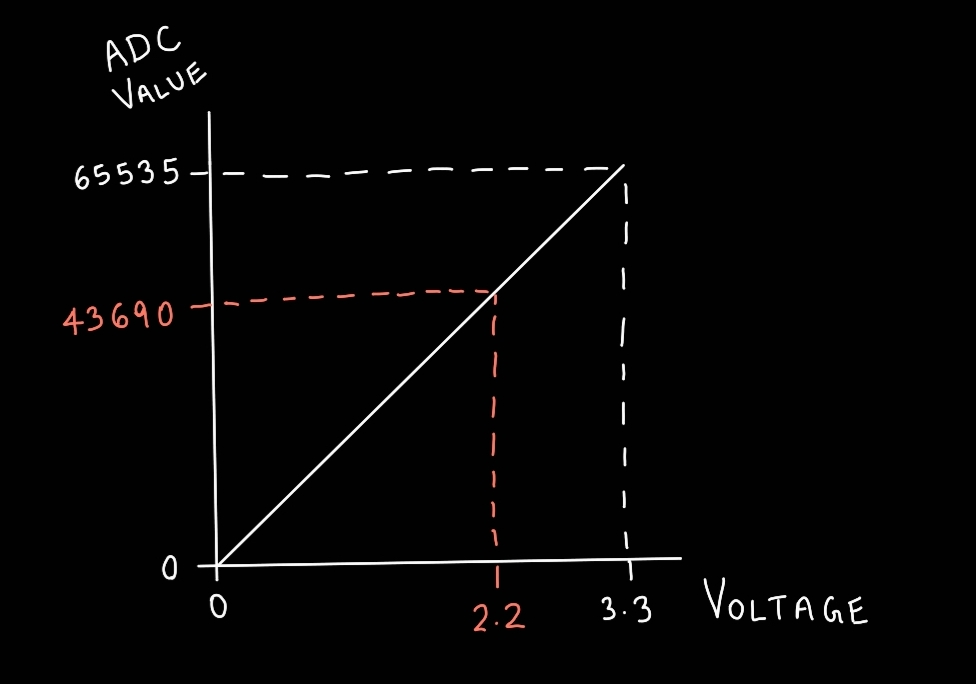 The relationship between the voltage seen by the ADC and the value it reports is linear. With that graph, it's clearer now why 2.2V corresponds to a reported value of 43690 on the Pico. If you would like to calculate that number instead of meticulously drawing a graph and finding the value by hand, there is a simple formula to convert voltage to ADC value.