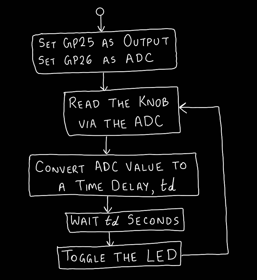 So far we've learned how to read the ADC, but we're not done yet. The real fun is in actually controlling things with the potentiometer. In our last tutorial, we wrote a program to blink the LED onboard the Pico every 0.5 seconds. But what if we want to change that number to make the LED blink faster or slower? We can use the potentiometer! The LED onboard the Pico is connected to pin GP25 - let's write a program to blink that LED, and use the knob to control its blink rate. This flowchart helps to visualize the program.