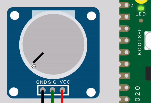 Let's connect them up! Connect GND to any ground pin on the Pico - I chose pin 18 at the bottom-left. Connect VCC to the 3.3V output pin, which is pin 36 at the top-right. Lastly, wire up the SIG pin to one of the ADC pins - I connected mine to ADC0 which is at pin GP26 on the right. After wiring, your setup should look similar to this: