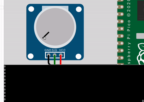 In the first two lines we import the necessary libraries. We then set up pin GP26 as an ADC. Next we start the infinite loop where we read the 16-bit value from the ADC pin, print out this value in the console window, and sleep the Pico for 0.1 seconds. Let's run the simulation and play with the knob to see it in action! Press the 'play' button at the top of the simulator pane and use your mouse to rotate the potentiometer.