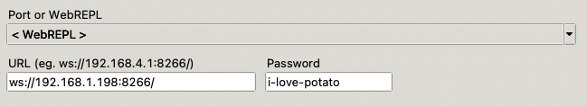 Now enter your ESP32's IP address and WebREPL password in the new menu. If you don't know your ESP32's IP address or have no clue how to configure the WebREPL password, fear not! There's a tutorial for that ? You can see an example of my IP address and password below.