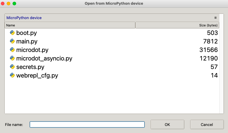 Now that you've got a connection, you can run commands on the REPL, of course. But even better is that you can look at the files on your ESP32 and open them up for editing right within Thonny! Click on the "open file" icon at the top of Thonny and it will load your filesystem over websockets.