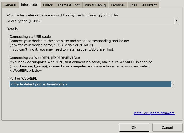 Click OK at the bottom and voila! If you set up everything right, you should see your shell pane pop up at the bottom of Thonny with the magic words everyone wants to hear: "WebREPL connected".